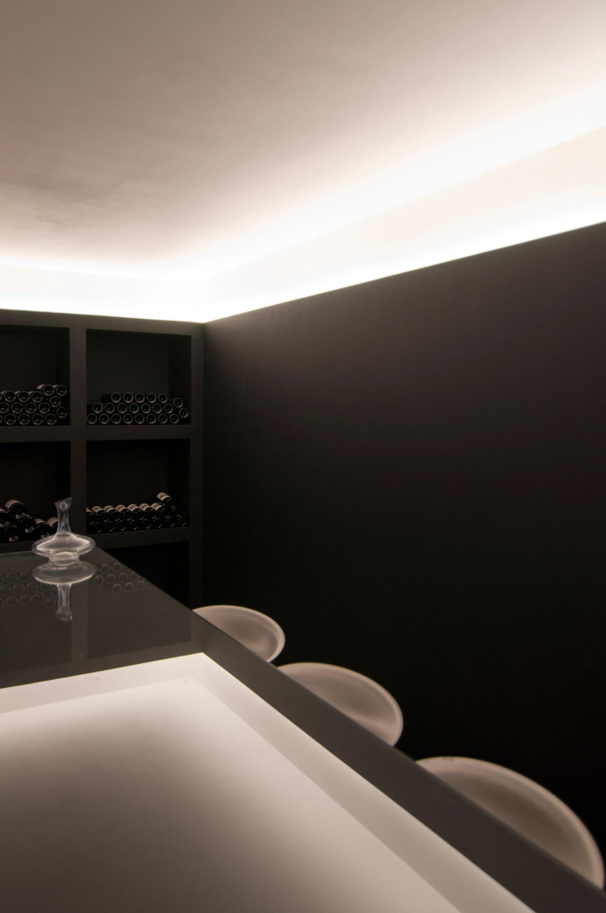 Objet. Aménagement d'une cave de dégustation : dans les reflets blancs et noirs